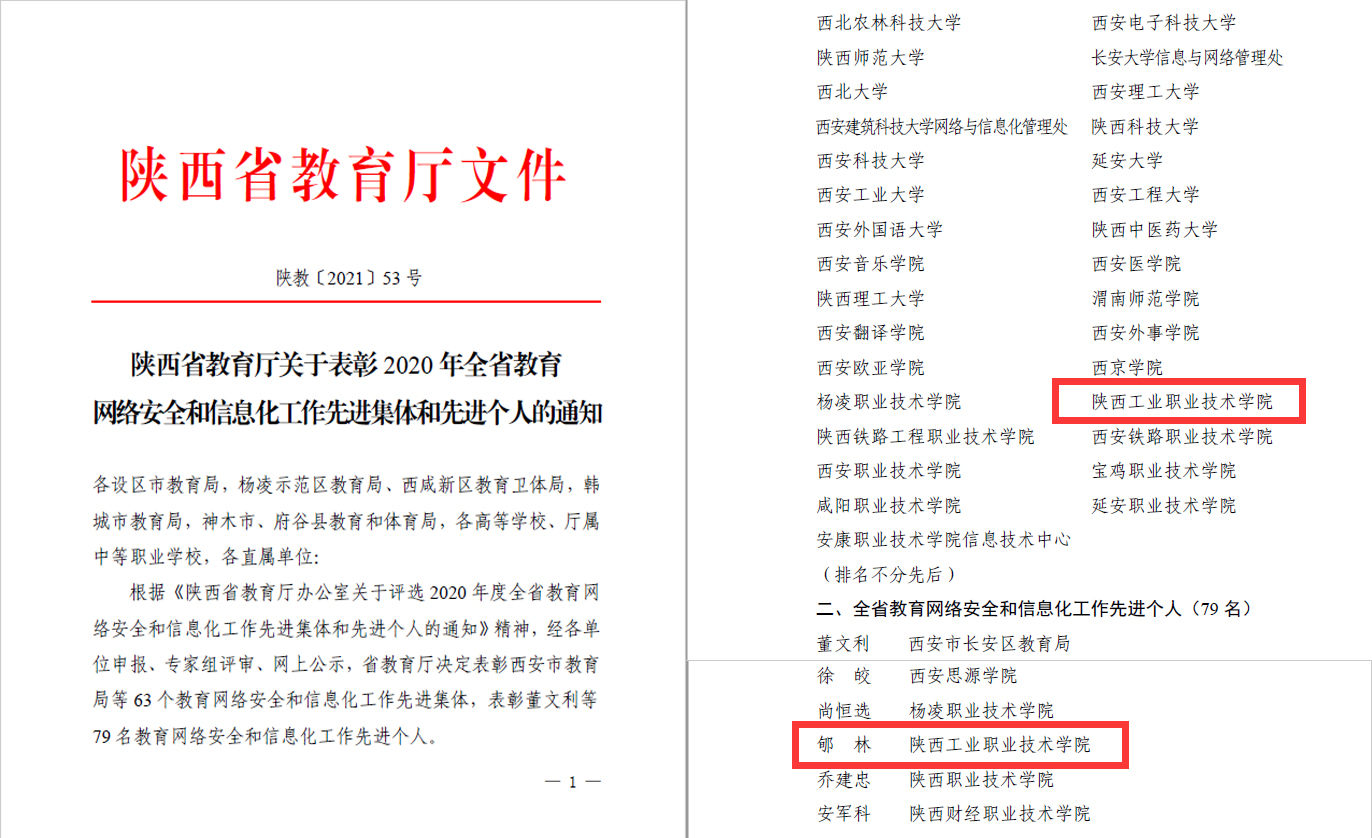 近日,陕西省教育厅下发《关于表彰2020年全省教育网络安全和信息化工作先进集体和先进个人的通知》(陕教[2021]53号),我校荣获“2020年度全省教育网络安全和信息化工作先进集体”称号,实现了我校在该项荣誉的三连冠。同时,我校信息化与网络安全处郇林同志获得“先进个人”称号,也实现了我校在信息化工作中又一个零的突破。