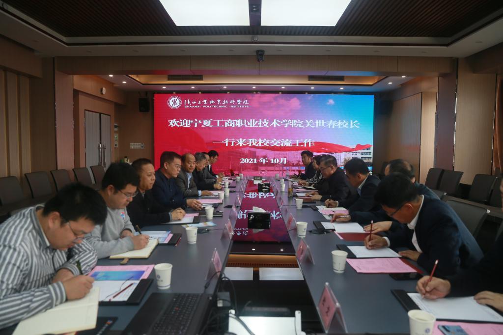 刘永亮校长对关世春校长一行的到来表示欢迎,在观看完学校宣传短片后对学校的办学模式、人才培养模式、师资队伍建设、新校区建设等相关内容进行了简要补充。关世春校长对我校的热情接待表示感谢,并对我校近年来取得的办学成绩大加赞赏,随后简要介绍了宁夏工商职业技术学院的办学规模、产教融合等相关内容。随后双方就科研、社会服务等问题进行了深入交流。