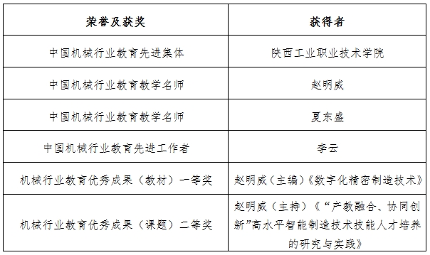 会上,我校获批“中国机械行业教育先进集体”;机械工程学院赵明威教授、电气工程学院夏东盛教授被评为“中国机械行业教育教学名师”;材料工程学院李云教授被评为“中国机械行业教育先进工作者”;赵明威教授主编的《数字化精密制造技术》获机械行业教育优秀成果(教材)一等奖,主持的《“产教融合、协同创新”高水平智能制造技术技能人才培养的研究与实践》获机械行业教育优秀成果(课题)二等奖。