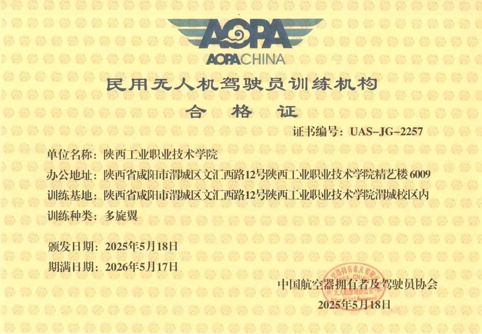 近日,我校正式获得由中国民用航空局(CAAC)颁发的民用无人驾驶航空器运营合格证(简称“运营合格证”)和民用无人机驾驶员训练机构合格证(简称“训练机构合格证”),成为咸阳市首家同时具备无人机运营与专业驾驶员培训资质的高职院校。